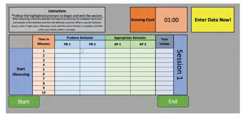 The task was rigidly defined. Using a laptop running an Excel-based electronic data collection system, caregivers recorded whether specific behaviors occurred during one-minute partial intervals. If a behavior occurred, it was to be entered immediately. If it did not, the caregiver was required to enter their initials within five seconds of the interval ending. Any entry earlier or later was scored as incorrect.