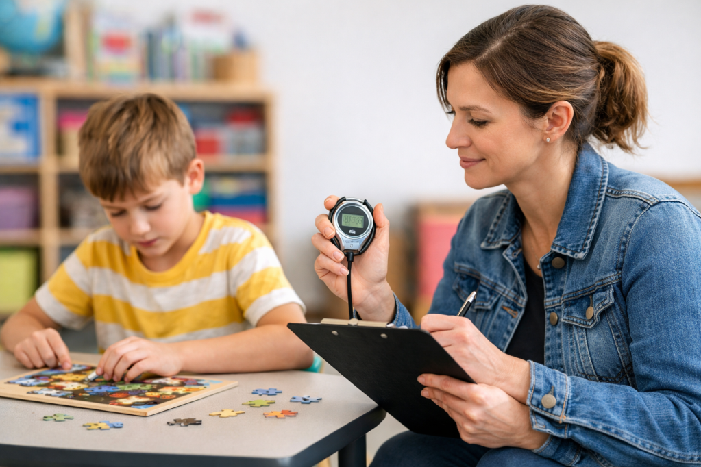 In the separate room: The same children also did a session-based analysis in a quieter room. Here, each session lasted ten minutes and focused on one type of situation at a time. In one session, an adult ignored the child until they produced the target behavior, then gave short attention and went back to ignoring. In another, the adult presented schoolwork, stopped it if the child protested, then started again. In another, a favorite item was removed, returned for a moment if the child reacted, and then removed again. The point was to record exactly when and why the behavior appeared most often. Each session ended with numbers: how many times the behavior occurred per minute.
