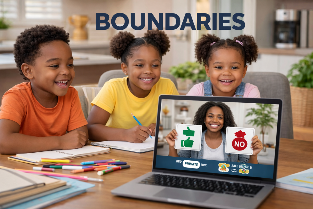 AI-generated image depicting three young Black children participating in an online lesson about boundaries, smiling and engaged as an instructor on the laptop screen uses visual cards to teach respect for personal space and consent.