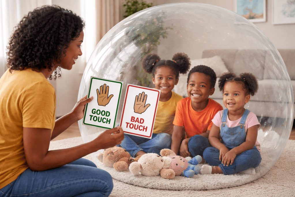 AI-generated image depicting three young Black children sitting inside a transparent protective bubble in a living room, while a parent stands outside the bubble holding two laminated cards labeled “Good Touch” and “Bad Touch.”