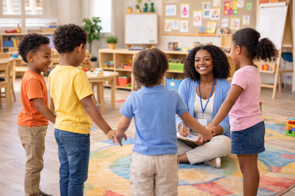 AI-generated image depicting a preschool classroom circle activity, where children hold hands in a group while a therapist guides the session in a warm, supportive learning environment.