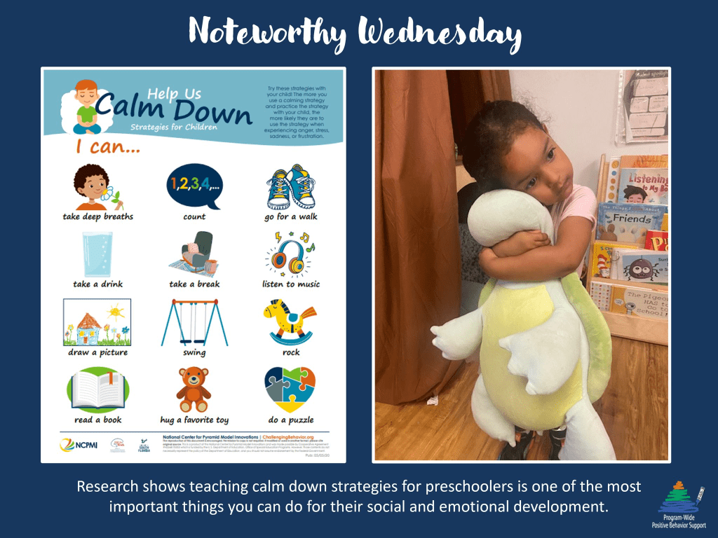 Publicly posted Facebook image from USF Preschool for Creative Learning highlighting calm-down strategies, featuring a young child hugging a stuffed toy to model emotional regulation skills.