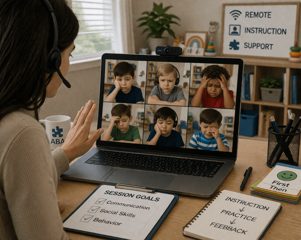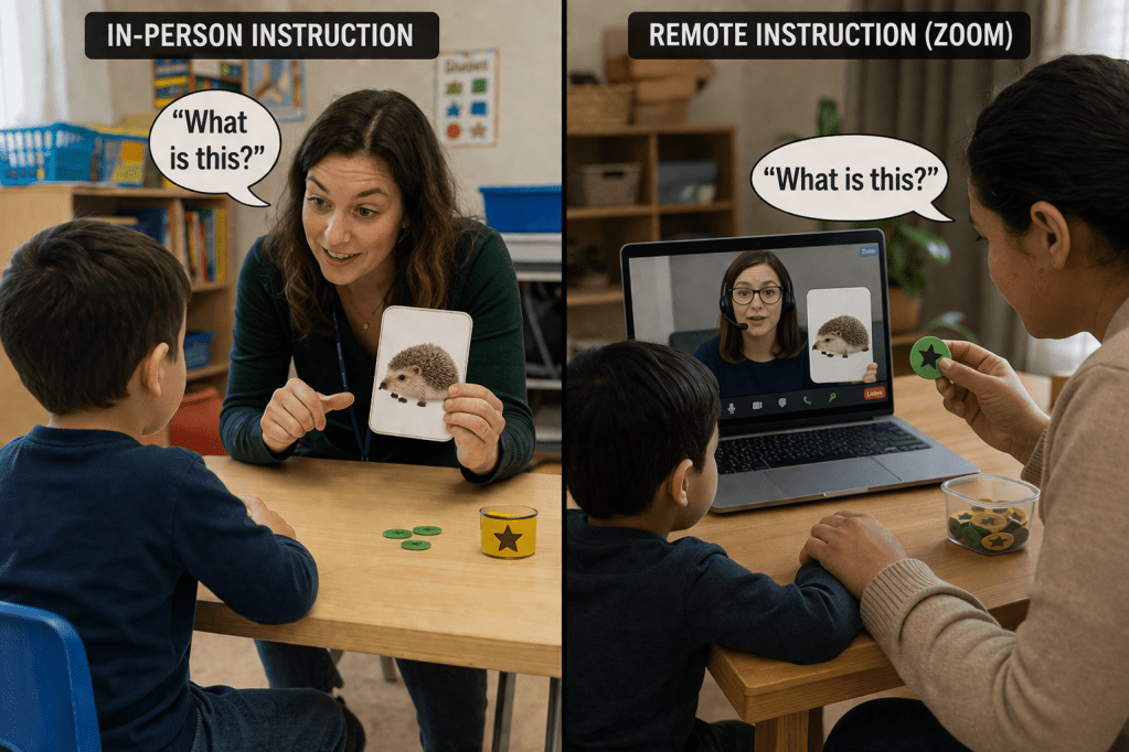 AI-generated image showing in-person and remote ABA instruction following the same sequence of question, response, and reinforcement. The difference is in delivery: direct teacher interaction in the classroom and caregiver-mediated instruction through a screen at home.