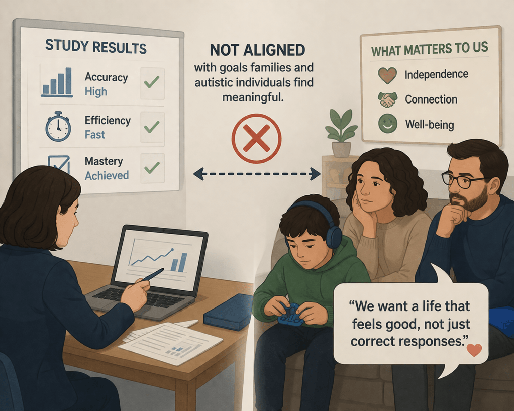 Measured outcomes align within the system, but may not align with what families and autistic individuals value.