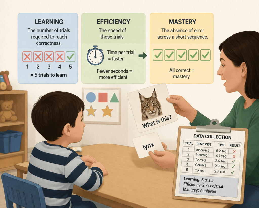The study defined learning as the point at which correct responding stabilized under repeated instruction. The study did not assess whether the child understood the word or could use it outside the teaching context. Instead, it tracked how many trials were required before the child produced correct responses for a fixed learning unit. Additionally, the experimenter logged how quickly those trials were delivered, and how many “correct responses” (targets) were met over time.