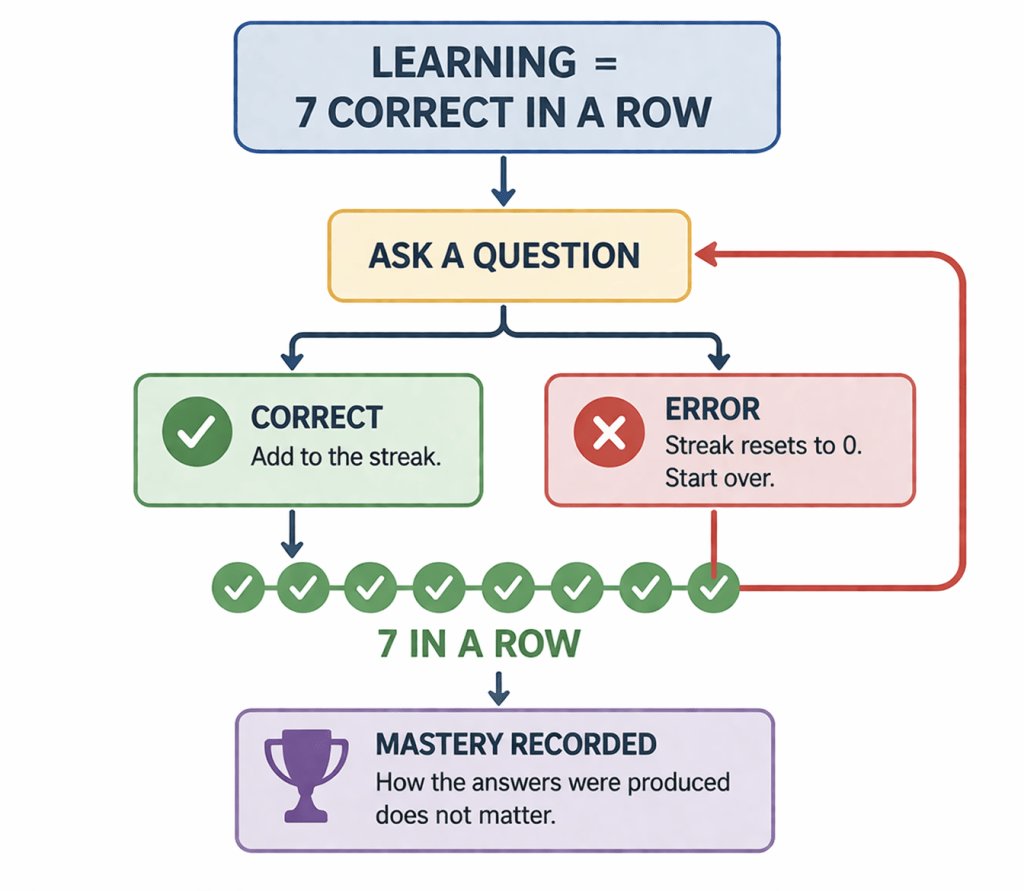 This repeated up to seven times. The same picture, or variations of it, appeared again and again until the child gave the correct answer seven times in a row. At that point, the program recorded the skill as “mastered” and moved on to a new item.