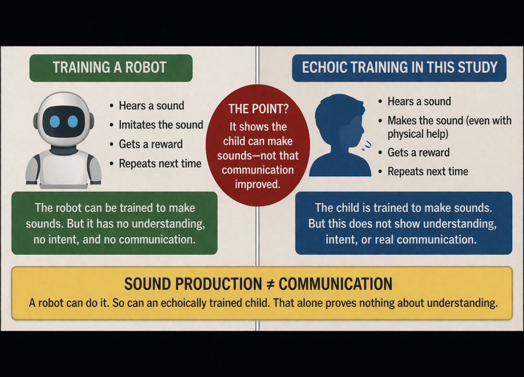 For families, this assumption carries practical consequences. Framing echoic gains as communication suggests a pathway toward speech and independence. The study showed that sounds can be produced during structured practice. It does not show that this leads to independent, functional communication.