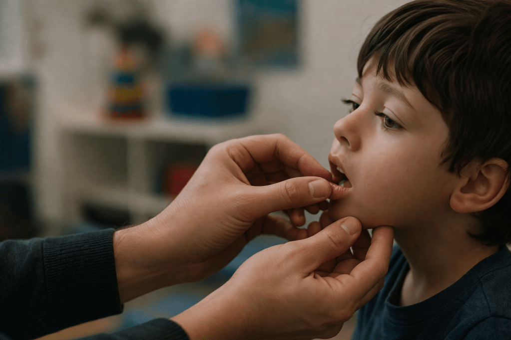 AI picture illustrating a therapist physically guiding a child’s mouth during speech training, highlighting the use of physical prompts in shaping vocal responses.