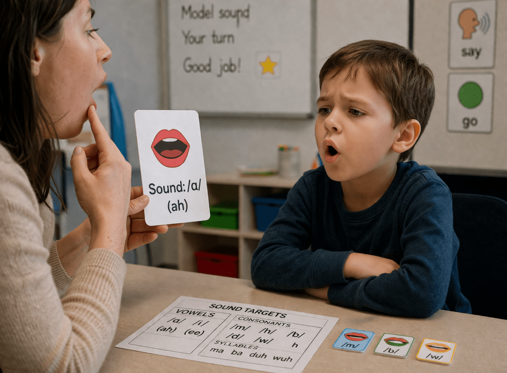 AI image illustrating a behavior technician introducing simple speech sounds (like “ah”) with visual cues, while the child imitates the sound, highlighting sound production compliance as a successful outcome of a behavior intervention.