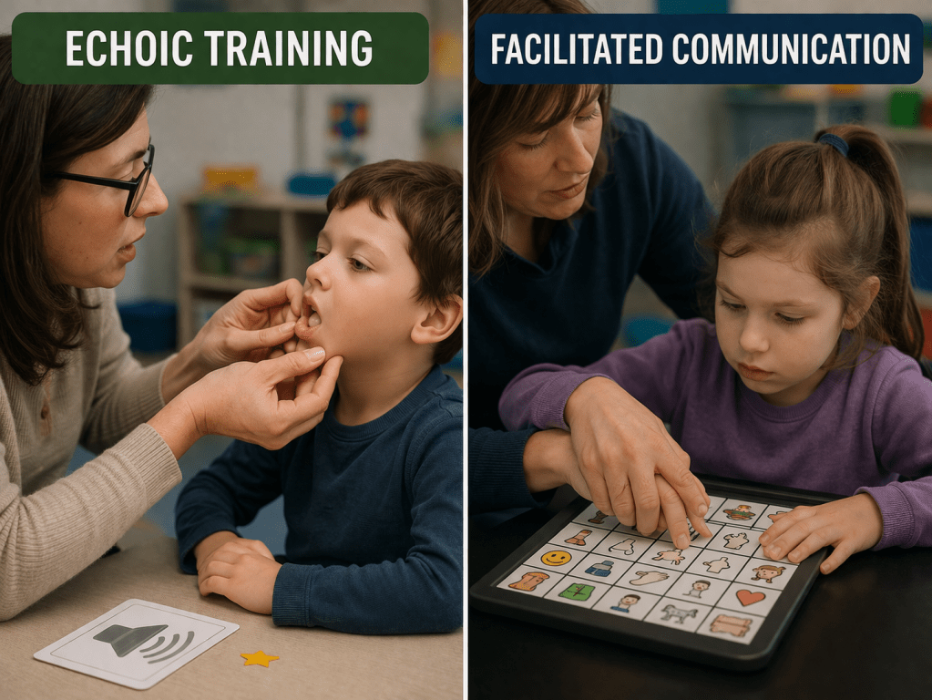 AI image comparing echoic training and facilitated communication, showing how physical support is used in both contexts but interpreted differently as valid or invalid communication.