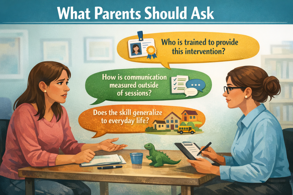 AI illustration of a parent asking critical questions about therapy goals, measurement, and whether skills truly carry over into real-life communication.